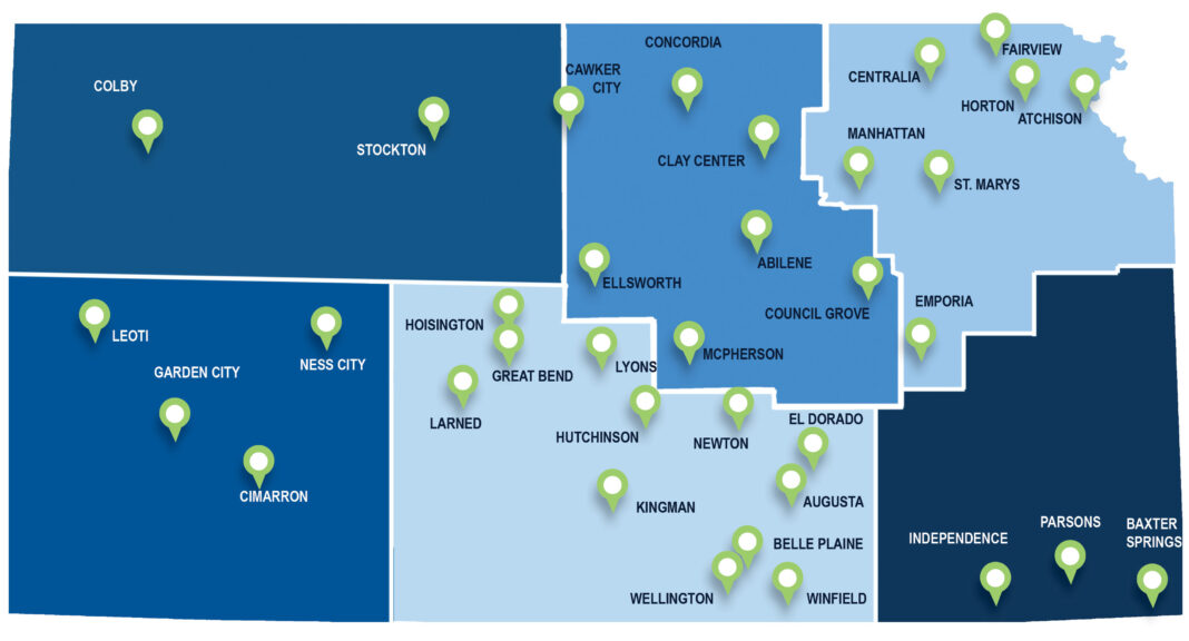 Les villes de Fairview, Centralia, Emporia, Horton, St. Marys, Atchison, Manhattan, Cawker City, Abilene, Clay Center, Concordia, McPherson, Council Grove, Ellsworth, Colby, Stockton, Baxter Springs, Parsons, Independence, Hoisington, Belle Plaine, Augusta, Larned, Kingman, Lyons, El Dorado, Hutchinson, Wellington, Newton, Winfield, Great Bend, Garden City, Ness City, Cimarron et Leoti recevront du financement.