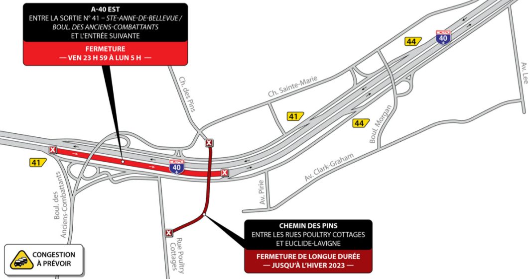 L’autoroute 40 sera fermée en direction est entre le boulevard des Anciens-Combattants et le chemin des Pins, au cours de la fin de semaine du 13 janvier 2023. Cette fermeture est requise dans le cadre de la poursuite des travaux de réparation du pont d’étagement du chemin des Pins indique le ministère des Transports et de la Mobilité durable.
