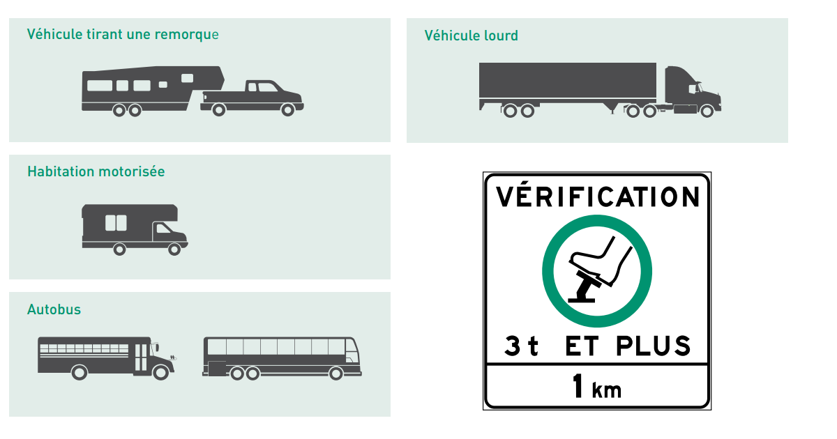 Pour plus de renseignements sur les aires de vérification des freins et les obligations des conducteurs, vous pouvez consulter : Société de l’assurance automobile du Québec.
