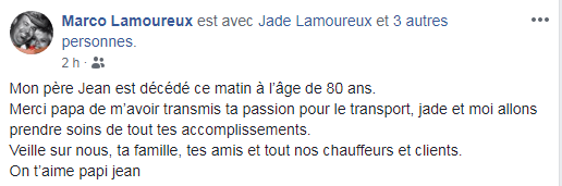 Nous avons appris que Monsieur Jean Lamoureux fondateur de Sherrington Transport est décédé ce matin à l’âge de 80 ans. Monsieur Lamoureux aura transmis sa passion à son fils Marco Lamoureux et sa petite-fille Jade qui occupe une place importante dans l’industrie.