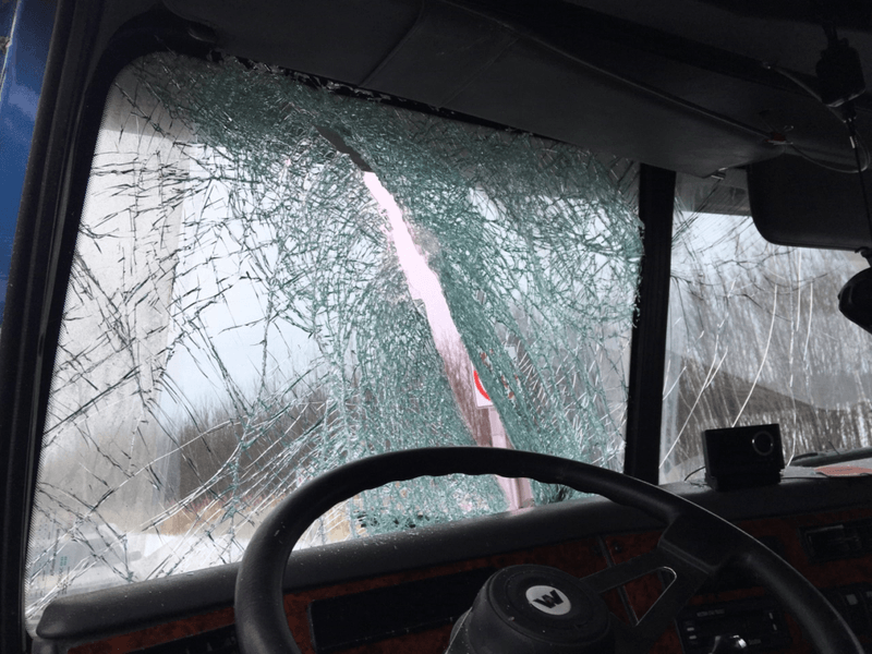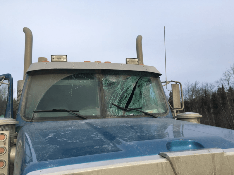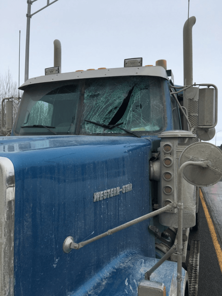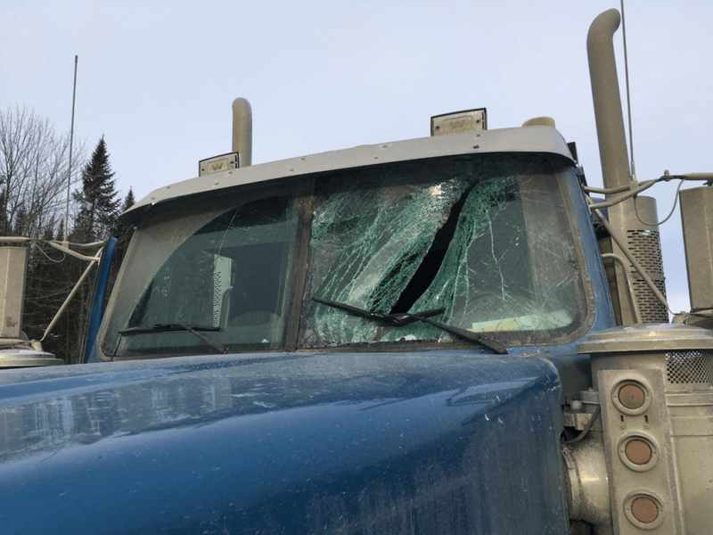 Un camionneur a eu la peur de sa vie aujourd’hui alors qu’il circulait sur l’autoroute 55 en direction sud à la hauteur de Saint-Wenceslas au Centre-du-Québec. Un immense morceau de glace s’est détaché du toit d’une autre semi-remorque qui circulait en direction nord sur la même autoroute et est venu percuter le pare-brise du camion qu’il conduisait. Le choc a été si violent que le bloc de glace a fracassé le pare-brise et a atteint le conducteur au visage et à l’épaule, avant d’être pulvérisé dans la couchette derrière le siège du conducteur.