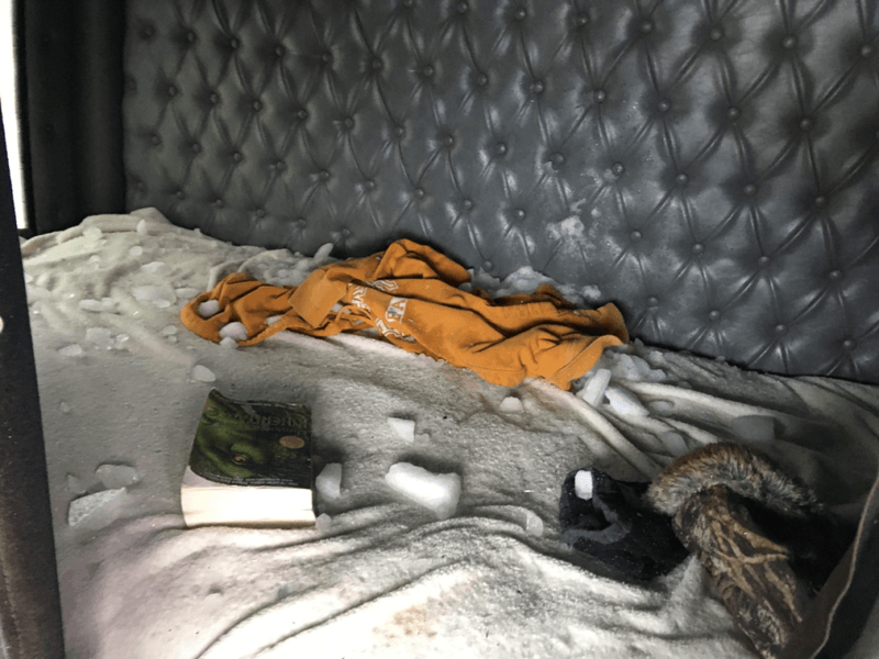 Il est facile de constater la force de l’impact sur les photos. Le trou béant dans le pare-brise du camionneur donne également une idée des dimensions du morceau de glace.