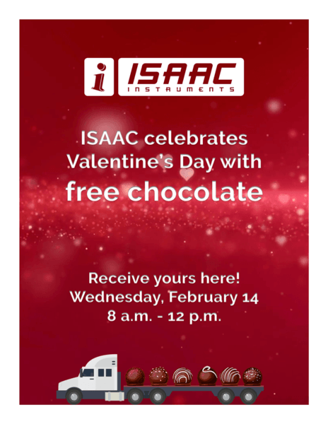 Chambly, le 1 février 2018 Pour les camionneurs et camionneuses sur la route à la Saint-Valentin, ISAAC Instruments offrira gratuitement une boîte de délicieux chocolats fins pour souligner leur dévouement au travail en toute occasion. Le mercredi 14 février, l’équipe d’ISAAC sera au truck stop Flying J situé au 1400 Britannia Road E, Mississauga de 8h à 12h.
