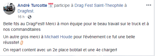 «Le potentiel de faire des courses à l’année et bel et bien réel pour ce nouveau circuit», a mentionné M. Therrien à la suite de sa visite. «Nous sommes fiers d’être plus que des partenaires du Dragfest, ce sont des amis. Je dois vous avouer que j’ai rarement vu un vendredi soir rempli comme ici avec en prime un chapiteau « bin plein » en soirée. On a fait beaucoup de promotion pour l’événement et les gens on bien répondu»
