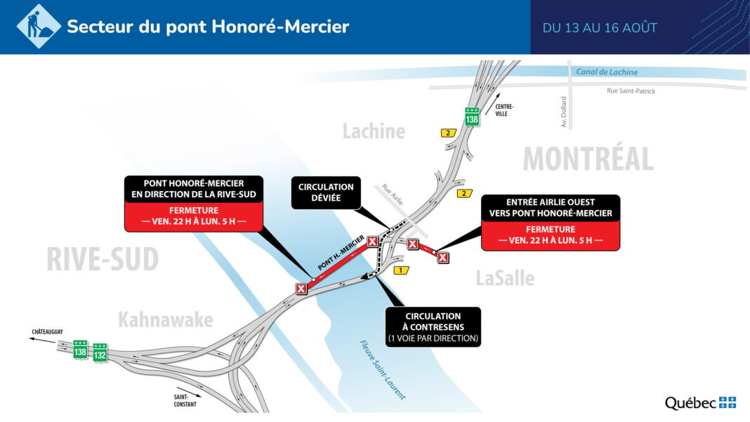 Le ministère des Transports informe les usagers de la route qu’il effectuera des travaux de réparation de dalles sur le pont Honoré-Mercier au cours de la fin de semaine du 13 août. Cette intervention requiert la mise en place d’une entrave partielle du vendredi soir au lundi matin.