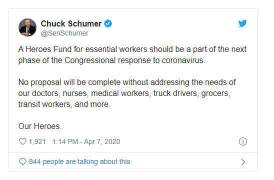 Les démocrates ont proposé une prime de risque majeur pour les travailleurs qui se retrouvent sur la première ligne contre le coronavirus. Mardi, le chef de la minorité sénatoriale Chuck Schumer et d’autres démocrates ont proposé un «Fonds des héros» pour les travailleurs qui fournissent des services essentiels aux États-Unis pendant la pandémie de coronavirus, y compris les travailleurs du domaine médical, les épiciers, les pharmaciens et les chauffeurs de camion.